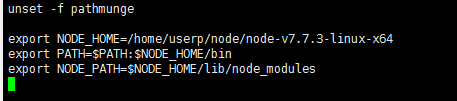 export NODE_HOME=/home/userp/node/node-v7.7.3-linux-x64 export PATH=$PATH:$NODE_HOME/bin export NODE_PATH=$NODE_HOME/lib/node_modules