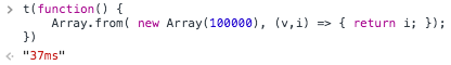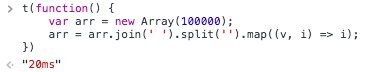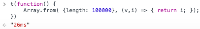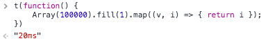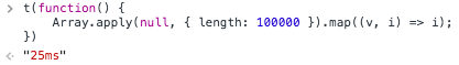 这里把长度为100000的伪数组传递给Array函数,构造出了一个长度为100000的数组,然后再用map赋值。有同学可能要问了,为什么不直接Array(100000)生成数组,这是因为通过Array(100000)生成的数组每个值都为undefined,无法通过map遍历。