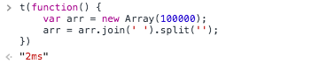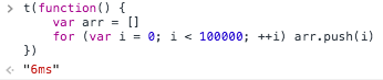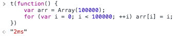 JavaScript有许多批量创建数组的方法,为了衡量它们的性能,我分别使用不同的方法创建一个长度为100000的数组,且键和值相等。同时,我定义了下面这个函数用来测量创建数组所耗费的时间: