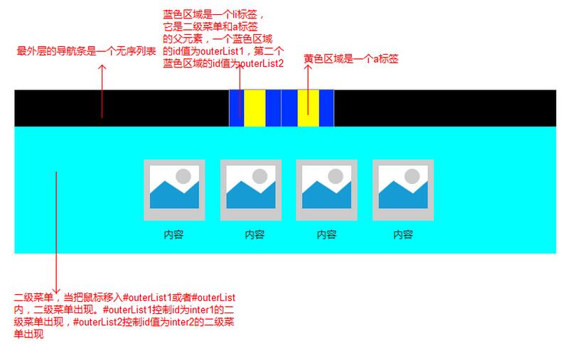 这个导航下拉菜单需要实现的功能是:下拉菜单的宽度与浏览器视口的宽度一样宽;一级导航只有两项,当鼠标移到一级导航上的导航项时,相应的二级导航出现。在本案例中通过改变二级导航的高度来实现二级导航的显示和消失。为了便于理解我画了一个图,如下: