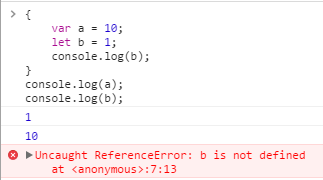 在上面的代码中,我们在代码块里,分别用 var 和 let 声明了两个变量,接着在代码块内外打印这两个变量,可以看到,var 声明的变量返回了正确的值,代码块内打印 let 声明的变量返回了正确的值,而在代码块外打印 let 声明的变量报错,这表明,let 声明的变量只在它所在的代码块有效