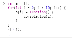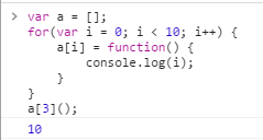 上面代码中,变量 i 是 var 声明的,在全局范围内都有效,所以全局只有一个变量 i,每一次循环,变量 i 的值都会发生改变,而循环内被赋给数组 a 的 function 在运行时,会通过闭包读到这同一个变量 i,导致最后输出的是最后一轮的 i 的值,也就是 10,而如果使用 let,声明的变量仅在块级作用域内有效,最后输出的是 6