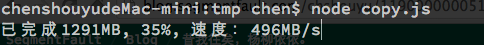 我们添加了一个递归的setTimeout(或者直接使用setInterval)来做一个旁观者,每500ms观察一次完成进度,并把已完成的大小、百分比和复制速度一并写到控制台上,当复制完成时,计算总的耗费时间,效果如图: