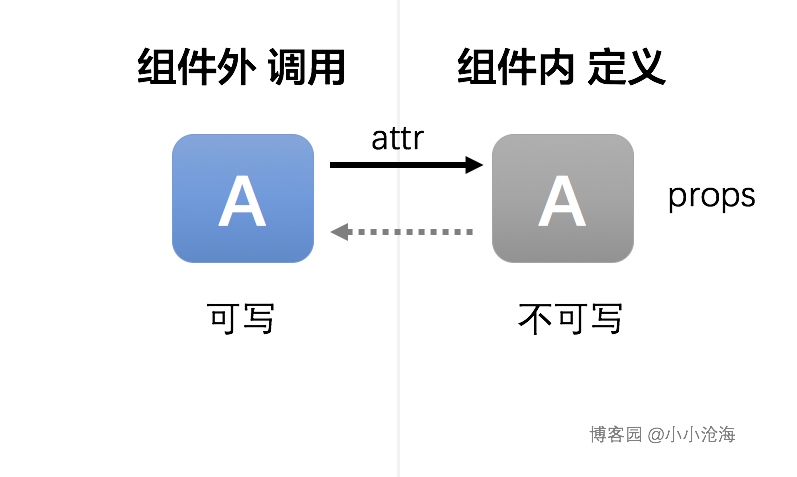 在Vue2中组件的props的数据流动改为了只能单向流动,即只能由组件外(调用组件方)通过组件的DOM属性attribute传递props给组件内,组件内只能被动接收组件外传递过来的数据,并且在组件内,不能修改由外层传来的props数据。
