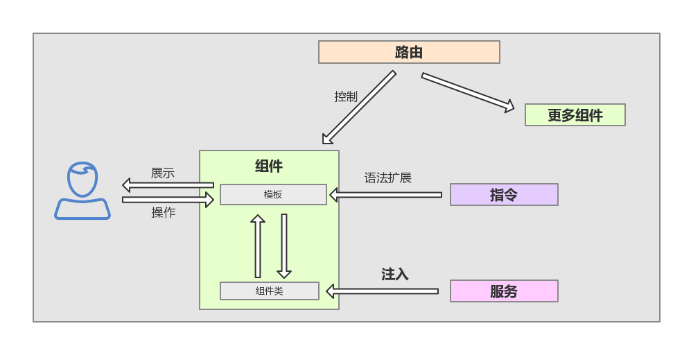1、与用户交互的是模板视图,模板和组件类共同组成组件