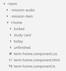 解释一下就是:最外层这个+term代表整个懒加载模块的目录,里面带加号的目录下的组件代表是页面组件,什么符号都没有的代表是布局组件,带减号的目录下的组件代表是单位组件,单位组件可能在整个懒加载模块中都使用到,所以直接在懒加载目录的最外层,而布局组件都在具体的页面组件同级目录下。