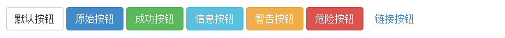 <!-- 标准的按钮 --> <button type="button" class="btn btn-default">默认按钮</button> <!-- 提供额外的视觉效果,标识一组按钮中的原始动作 --> <button type="button" class="btn btn-primary">原始按钮</button> <!-- 表示一个成功的或积极的动作 --> <button type="button" class="btn btn-success">成功按钮</button> <!-- 信息警告消息的上下文按钮 --> <button type="button" class="btn btn-info">信息按钮</button> <!-- 表示应谨慎采取的动作 --> <button type="button" class="btn btn-warning">警告按钮</button> <!-- 表示一个危险的或潜在的负面动作 --> <button type="button" class="btn btn-danger">危险按钮</button> <!-- 并不强调是一个按钮,看起来像一个链接,但同时保持按钮的行为 --> <button type="button" class="btn btn-link">链接按钮</button>
