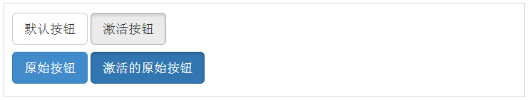 <p> <button type="button" class="btn btn-default btn-lg ">默认按钮</button> <button type="button" class="btn btn-default btn-lg active">激活按钮</button> </p> <p> <button type="button" class="btn btn-primary btn-lg ">原始按钮</button> <button type="button" class="btn btn-primary btn-lg active">激活的原始按钮</button> </p>