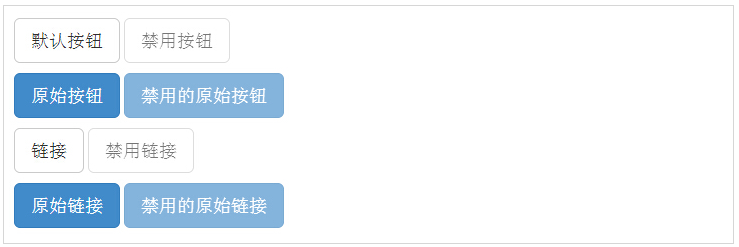 <p> <button type="button" class="btn btn-default btn-lg">默认按钮</button> <button type="button" class="btn btn-default btn-lg" disabled="disabled">禁用按钮</button> </p> <p> <button type="button" class="btn btn-primary btn-lg ">原始按钮</button> <button type="button" class="btn btn-primary btn-lg" disabled="disabled">禁用的原始按钮</button> </p> <p> <a href="#" rel="external nofollow" rel="external nofollow" rel="external nofollow" rel="external nofollow" rel="external nofollow" class="btn btn-default btn-lg" role="button">链接</a> <a href="#" rel="external nofollow" rel="external nofollow" rel="external nofollow" rel="external nofollow" rel="external nofollow" class="btn btn-default btn-lg disabled" role="button">禁用链接</a> </p> <p> <a href="#" rel="external nofollow" rel="external nofollow" rel="external nofollow" rel="external nofollow" rel="external nofollow" class="btn btn-primary btn-lg" role="button">原始链接</a> <a href="#" rel="external nofollow" rel="external nofollow" rel="external nofollow" rel="external nofollow" rel="external nofollow" class="btn btn-primary btn-lg disabled" role="button">禁用的原始链接</a> </p>