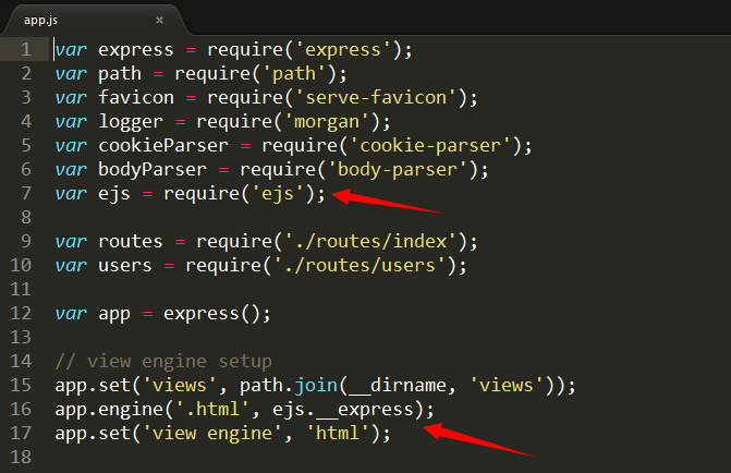 若希望模板文件的后缀为.html(通常只是为了看着更舒服),那么在手动将.ejs换成.html后,还需要对app.js文件进行设置