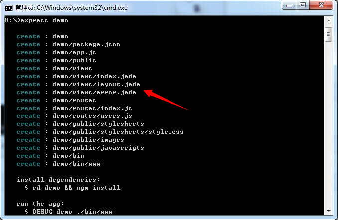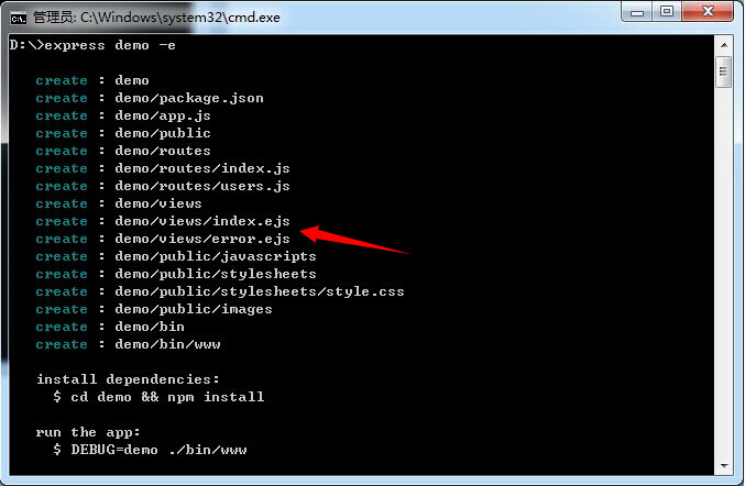在项目名称的后面添加 -e 那么创建出来的模板文件就是.ejs类型,语法是与html相同的