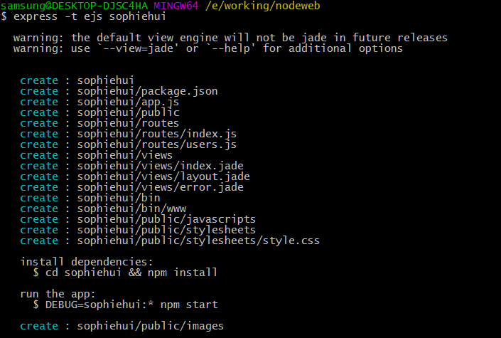 在使用express创建一个网站的时候,使用ejs模板引擎,建立基本的网站结构,当前目录下使用:express -t ejs sophiehui命令就在当前目录下创建了一个sophiehui的子目录,创建信息如图片所示: