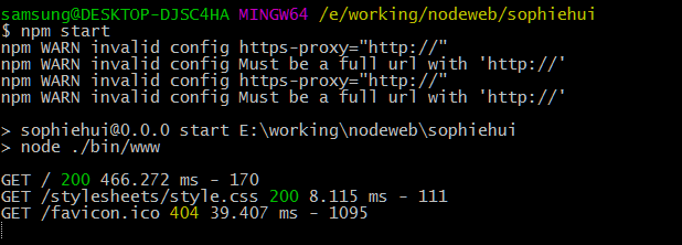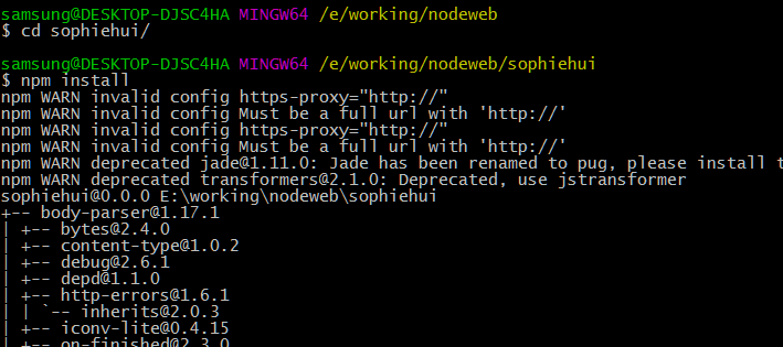 倒数第四行提示我们安装依赖,所以接下来进入sophiehui这个目录安装依赖:npm install(无参数的npm install的功能就是检查当前目录下的package.json文件,并自动安装所有指定的依赖)