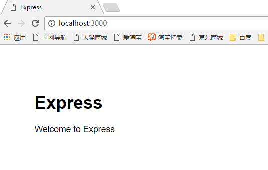 查看你的第一个express应用:npm start(命令提示窗口下使用:node app.js),然后访问http://localhost:3000/就能看到下图二的效果了。