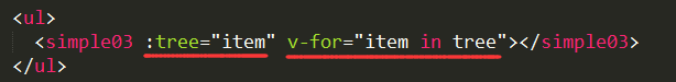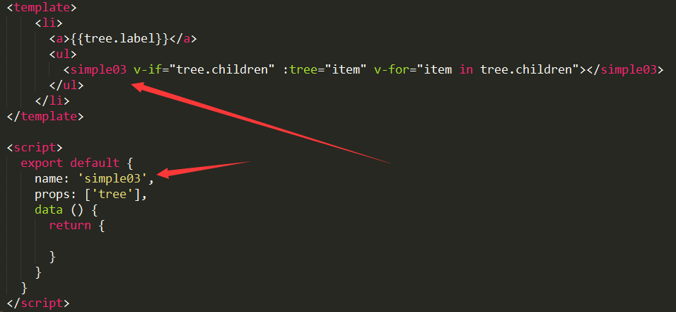 上面是一个子组件,定义了 name 为 simple03,然后在模板中调用自身,结合 v-for 实现递归