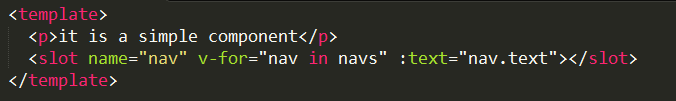 这个示例中,首先在子组件中添加 <slot>,并在子组件中定义了数组变量 navs