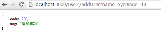 因为前面实现的是一个get请求的add方法, 所以可以在浏览器中直接使用地址访问,进入路由, http://localhost:3000/users/addUser?name=xyz&age=18.如果你得到如下JSON返回或看到数据表中有上面的数据插入,表示整合成功了