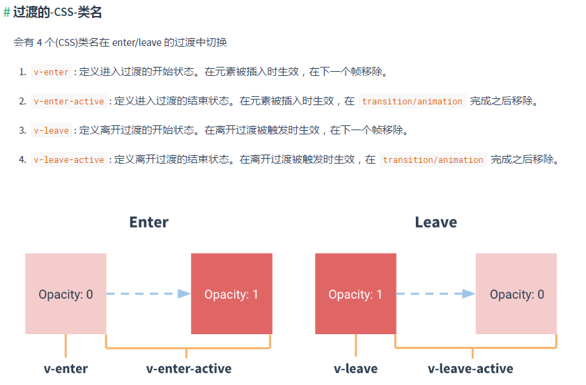 另外,过渡的效果transition都定义在上面的两个样式中,也难怪官方文档中v-enter-active和v-leave-active表示的是一段距离。