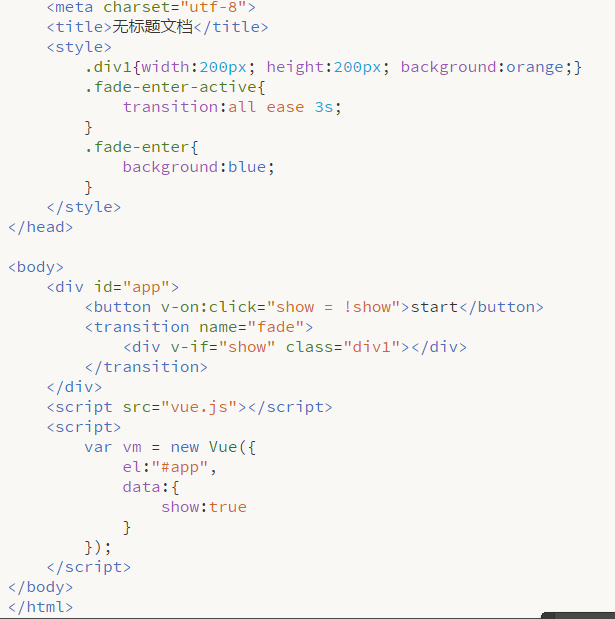 结果:点击按钮,show=false时,div消失;再次点击,show=true,div用蓝色逐渐变成橙色,过渡时间为3s。