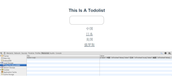 用vue.js实现一个todolist项目:input输入框输入的值会呈现在下方,并且会保存在localStorage里面,而且下方的列表点击之后也会有变化: