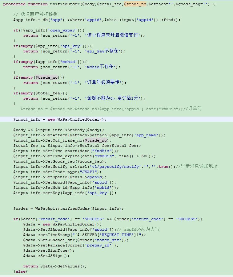 封装对外的统一下单接口,直接返回小程序调用支付接口所需的参数:
