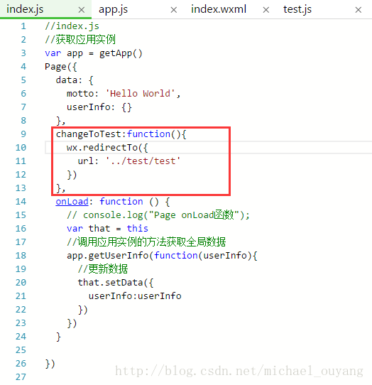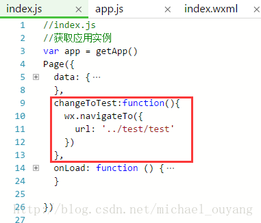 在index.js中的Page函数内部,添加changeToTest 函数,函数里面使用wx.navigateTo,写上需要跳转的页面,里面传入的是一个对象,对象内使用url属性,对应的就是需要跳转的页面的路径(注意:这是接收的是一个相对路径,并且页面不需要使用.wxml后缀)