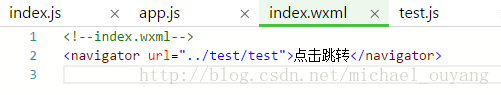 在index.wxml页面添加一个<navigator>元素,在元素里面使用属性url就可以