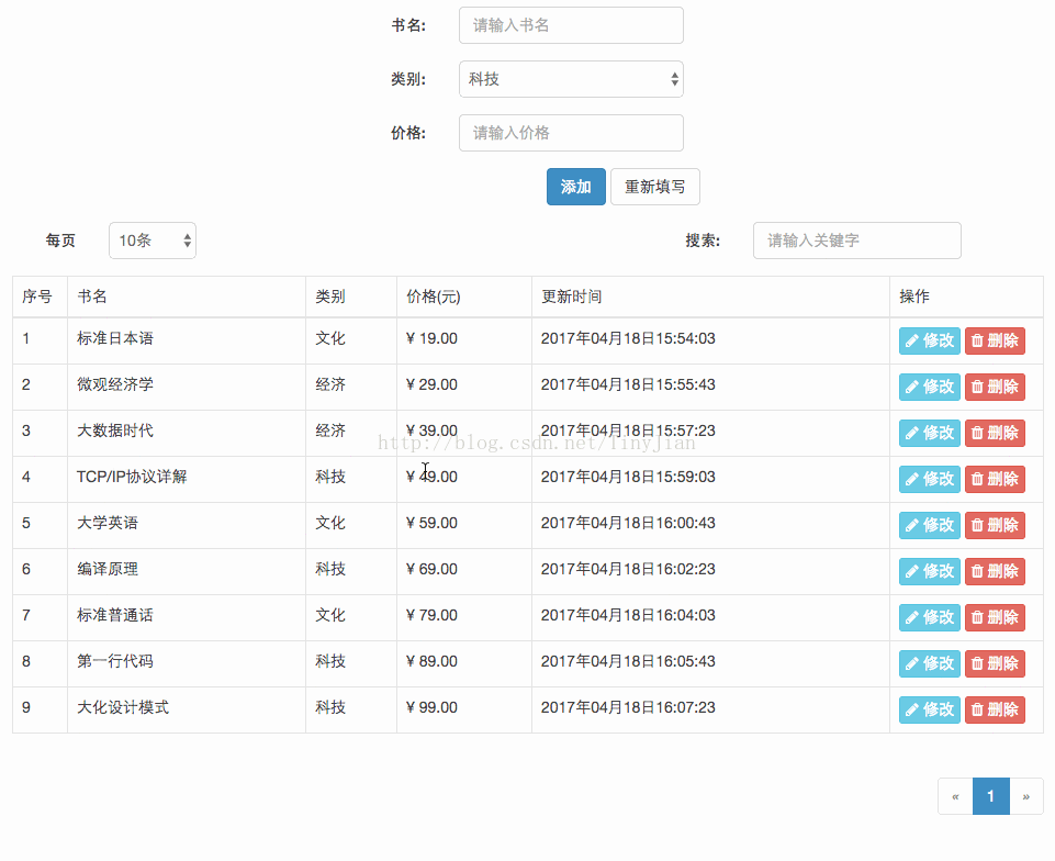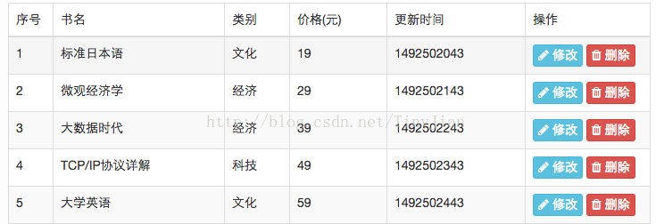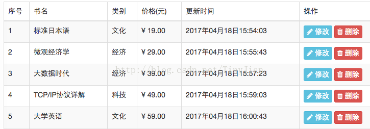 <tr v-for="(book, key) in book_list"> <td v-text="key + 1"></td> <td v-text="book.name"></td> <td v-text="book.type"></td> <td v-text="book.price"></td> <td v-text="book.time"></td> <td> <button class="btn btn-info btn-xs"> <i class="fa fa-pencil"></i> 修改 </button> <button class="btn btn-danger btn-xs"> <i class="fa fa-trash"></i> 删除 </button> </td> </tr>