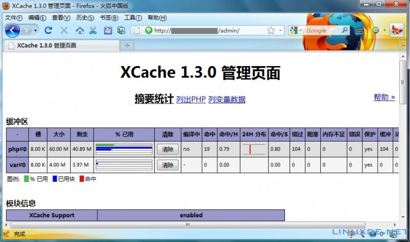 然后重新启动PHP,然后访问http://localhost/admin ,用户名为xcache 密码为123456;另外,还可以通过phpinfo来验证PHP是否支持Xcache