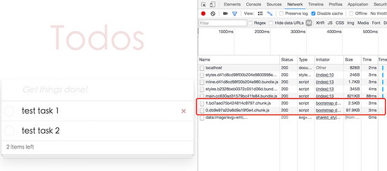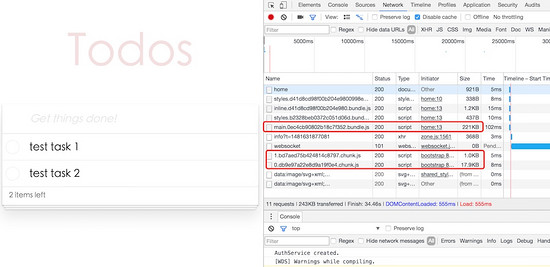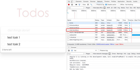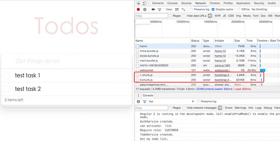 这下main文件减少到了221K,lazy模块对应的js文件是 1.chunk.js ,只有1.0k,todo模块对应的文件 0.chunk.js 是17.9K。总共大小大概是240K左右,如果再使用GZip压缩,应该可以到6,70K左右。在官方文档里提到,一个Angular2的简单实例,通过Tree Shaking、压缩、GZip,最终下载的包大小有50K。我们这个实例毕竟稍微复杂,实现了大多数的通用功能,如路由、guard、resolver、表单,也是用到了Rxjs里的 Observable ,所以最终压缩后能有70K左右的话,也符合官方文档的说法。