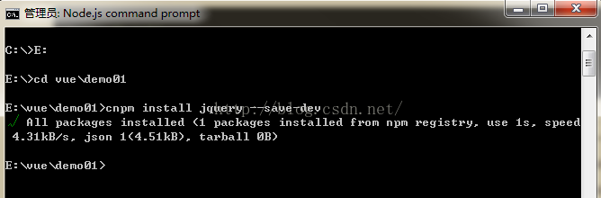 4、让vue支持jQuery需要先安装jquery插件,通过cmd命令进入项目文件夹,然后运行 cnpm install jquery --save-dev 安装插件