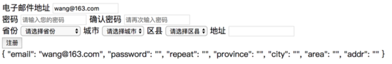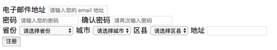 <!-- template-driven.component.html --> <form novalidate> <label> <span>电子邮件地址</span> <input type="text" name="email" placeholder="请输入您的 email 地址"> </label> <div> <label> <span>密码</span> <input type="password" name="password" placeholder="请输入您的密码"> </label> <label> <span>确认密码</span> <input type="password" name="repeat" placeholder="请再次输入密码"> </label> </div> <div > <label> <span>省份</span> <select name="province"> <option value="">请选择省份</option> </select> </label> <label> <span>城市</span> <select name="city"> <option value="">请选择城市</option> </select> </label> <label> <span>区县</span> <select name="area"> <option value="">请选择区县</option> </select> </label> <label> <span>地址</span> <input type="text" name="addr"> </label> </div> <button type="submit">注册</button> </form>