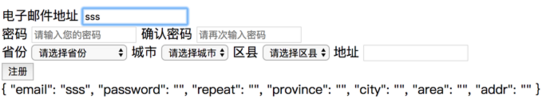 这时如果我们在 email 中输入 sss ,可以看到下图的以 JSON 形式出现的表单值: