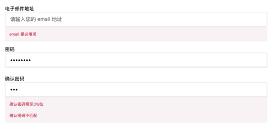 我们看到,如果不填电子邮件的话,错误的 JSON 是 {"required": true} ,这告诉我们目前有一个 required 的规则没有被满足。