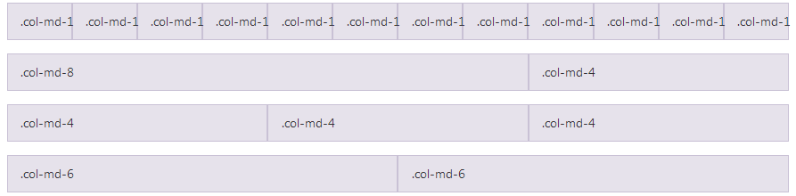 <div class="row"> <div class="col-md-1">.col-md-1</div> <div class="col-md-1">.col-md-1</div> <div class="col-md-1">.col-md-1</div> <div class="col-md-1">.col-md-1</div> <div class="col-md-1">.col-md-1</div> <div class="col-md-1">.col-md-1</div> <div class="col-md-1">.col-md-1</div> <div class="col-md-1">.col-md-1</div> <div class="col-md-1">.col-md-1</div> <div class="col-md-1">.col-md-1</div> <div class="col-md-1">.col-md-1</div> <div class="col-md-1">.col-md-1</div> </div> <div class="row"> <div class="col-md-8">.col-md-8</div> <div class="col-md-4">.col-md-4</div> </div> <div class="row"> <div class="col-md-4">.col-md-4</div> <div class="col-md-4">.col-md-4</div> <div class="col-md-4">.col-md-4</div> </div> <div class="row"> <div class="col-md-6">.col-md-6</div> <div class="col-md-6">.col-md-6</div> </div>