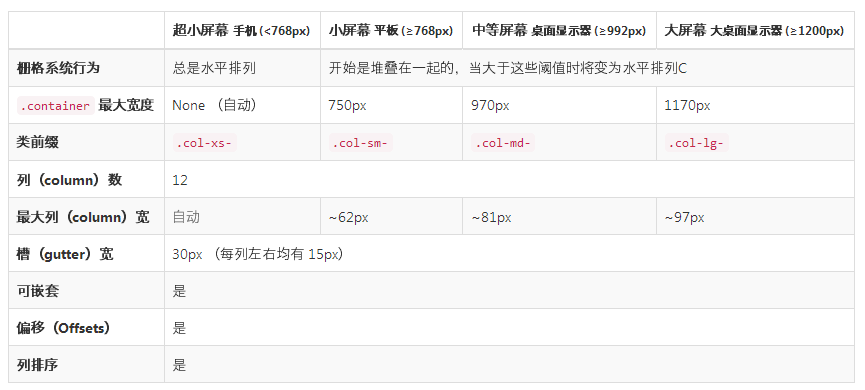 如上表:由于bootstrap是移动优先的,所以在判定时先从小屏开始,如col-xs-6指的是从width=768开始直到最大都是占6个单位的空间。