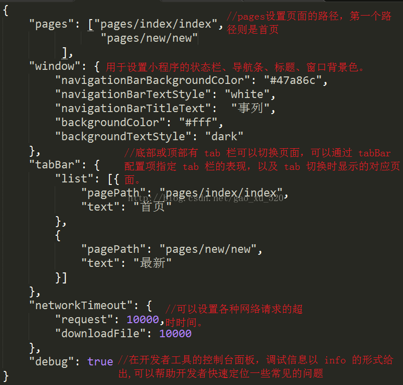 使用app.json文件来对微信小程序进行全局配置,决定页面文件的路径、窗口表现、设置网络超时时间、设置多 tab 等.
