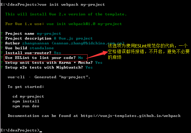 3、使用vue建一个项目名叫“my-project”(vue init webpack my-project),注意项目名不能有大写。
