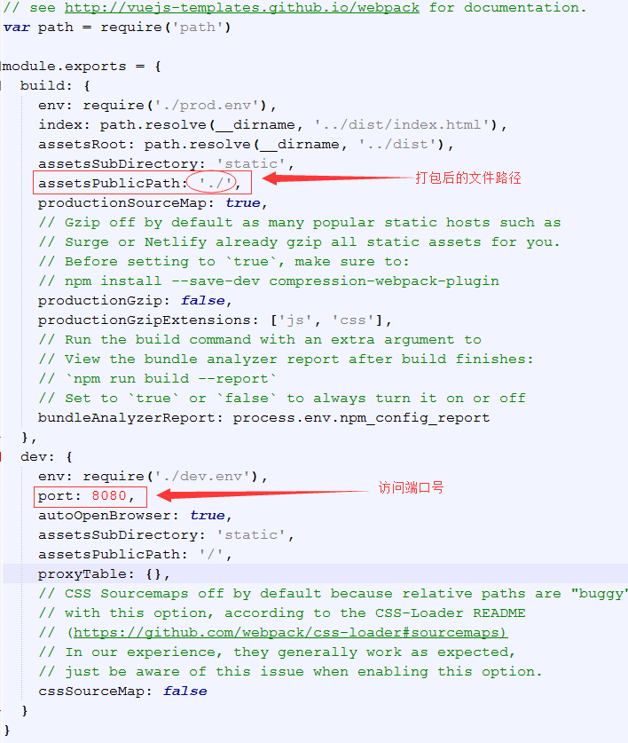 建议将端口号改为不常用的端口。另外我还将 build 的路径前缀修改为 ' ./ '(原本为 ' / '),是因为打包之后,外部引入 js 和 css 文件时,如果路径以 ' / ' 开头,在本地是无法找到对应文件的(服务器上没问题)。所以如果需要在本地打开打包后的文件,就得修改文件路径。