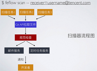 在一个工程项目中,有各种各样的规范,比如项目命名规范、描述规范、目录结构规范、README.md规范,是否增加基本监控等等。编写扫描器scanner,对某个Group里面的所有业务项目进行扫描,将不符合规范的仓库和不符合规范的地方列举出来,并且捞出责任人。最后通过邮件及定时任务发送给相关同学,并且敦促修改。扫描器流程图如下: