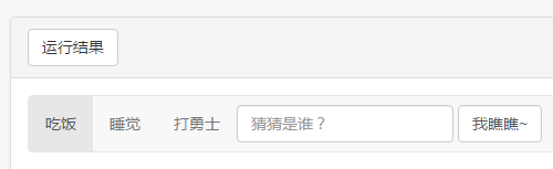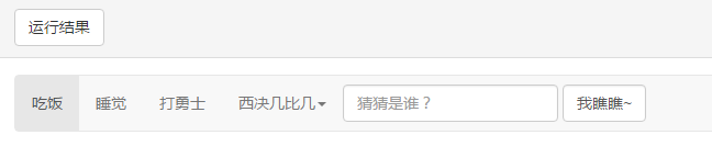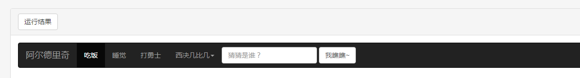 <nav class="navbar navbar-default"> <ul class="nav navbar-nav"> <li class="active"><a href="#" rel="external nofollow" rel="external nofollow" rel="external nofollow" rel="external nofollow" rel="external nofollow" rel="external nofollow" rel="external nofollow" rel="external nofollow" rel="external nofollow" rel="external nofollow" rel="external nofollow" rel="external nofollow" rel="external nofollow" rel="external nofollow" rel="external nofollow" rel="external nofollow" rel="external nofollow" >吃饭</a></li> <li><a href="#" rel="external nofollow" rel="external nofollow" rel="external nofollow" rel="external nofollow" rel="external nofollow" rel="external nofollow" rel="external nofollow" rel="external nofollow" rel="external nofollow" rel="external nofollow" rel="external nofollow" rel="external nofollow" rel="external nofollow" rel="external nofollow" rel="external nofollow" rel="external nofollow" rel="external nofollow" >睡觉</a></li> <li><a href="#" rel="external nofollow" rel="external nofollow" rel="external nofollow" rel="external nofollow" rel="external nofollow" rel="external nofollow" rel="external nofollow" rel="external nofollow" rel="external nofollow" rel="external nofollow" rel="external nofollow" rel="external nofollow" rel="external nofollow" rel="external nofollow" rel="external nofollow" rel="external nofollow" rel="external nofollow" >打勇士</a></li> </ul> <form class="navbar-form"> <input type="text" class="form-control" placeholder="猜猜是谁?"> <input type="submit" class="form-control" value="我瞧瞧~"> </form> </nav>