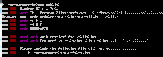 这里我还特意查了下ENEEDAUTH错误,可是却没看后面的提示:You need to authorize this machine using 'npm adduser'