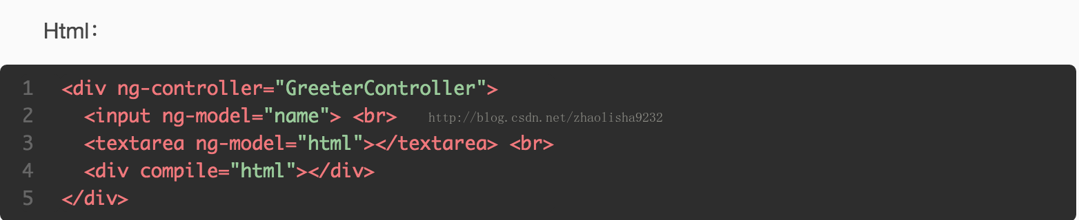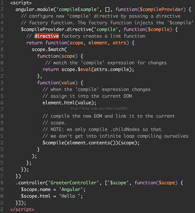 用$compile服务创建一个directive ‘compile',这个complie会将传入的html字符串或者DOM转换为一个template,然后直接在html里调用compile即可