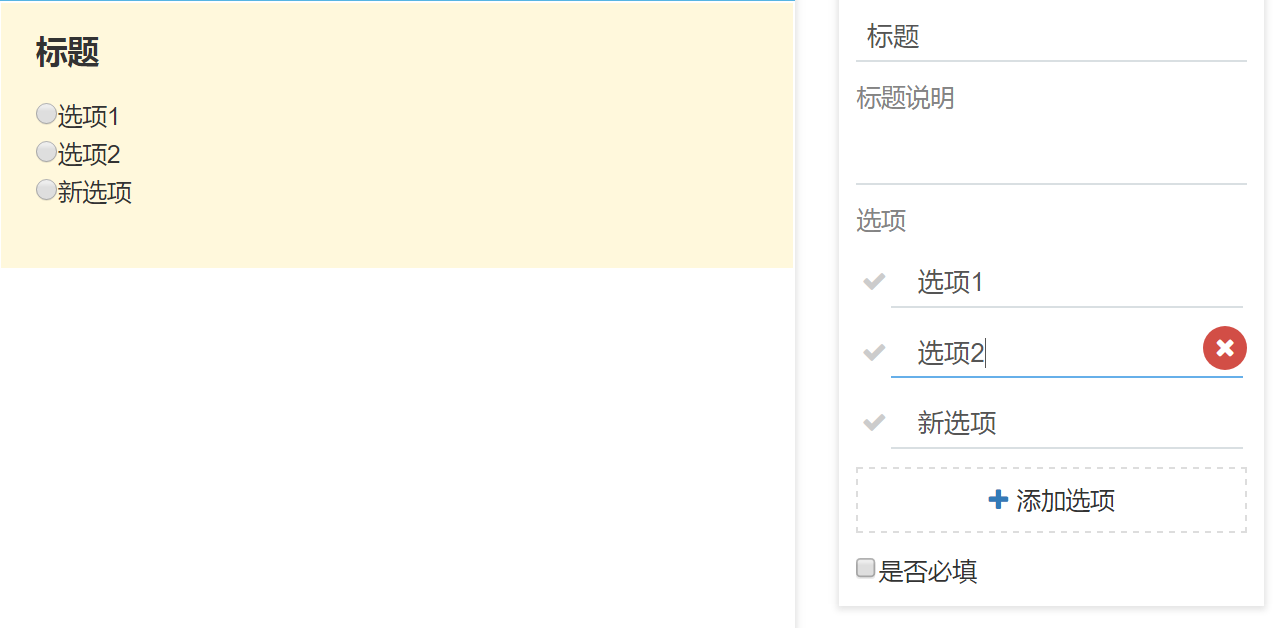 上图效果,动态添加绑定radio选项,然后也可以动态删除,右边编辑器删除,左边的视图也对应的删除。