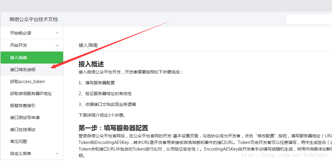 如果在没有考虑清楚之前,就开始码代码的话,这样做是非常危险的。我们先打开微信文档,点击 开始开发 中的 接入指南,如图:
