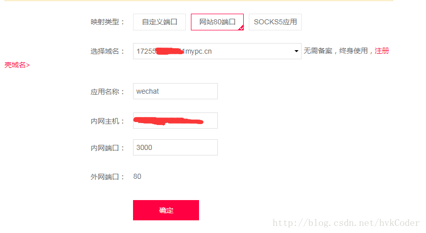由于微信只接受80端口,我们在映射类型选择为 网站80端口;内网主机就是我们电脑的 IP 地址;内网端口号就是node.js的监听端口;点击确定后,就成功映射到外网了,可以通过花生壳提供的域名进行访问。