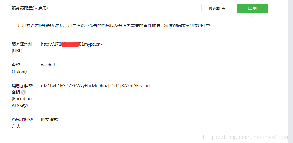 点击修改配置。其中服务器地址,就是我们外网映射的地址;令牌(Token)就是我们在 config.json 文件中 定义的 token 值;消息加密可以点击随机生成按钮,当然你也可以随便定义;消息加解密方式这块可以随便选择,这里我就使用默认的,如图: