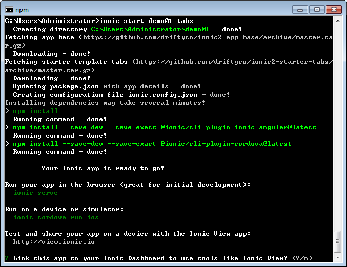 4.ionic安装成功之后,即可创建你的第一个项目:ionic start myApp tabs 此处默认创建ionic2的项目,如果需要创建ionic1.x版本,则在命令的最后面加上 --v1。另外此处是tabs是模板的意思,另外还有blank/sidemenu/tutorial/super等几个模板。