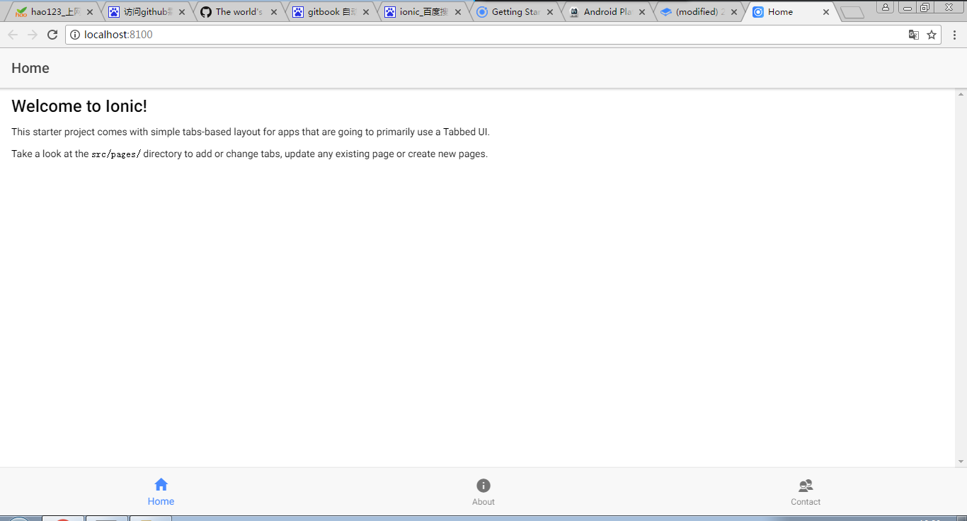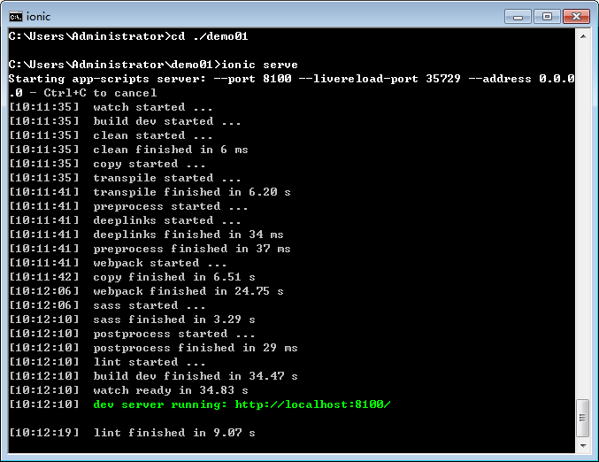 5.项目创建成功后,cd到项目根目录,运行ionic serve即可运行项目,会自动打开浏览器查看。
