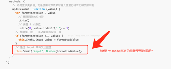 我们看上图中的代码,有行 $emit的代码,这行代码实际上会触发一个 input事件, 'input'后的参数就是传递给v-model绑定的属性的值,也就是说 v-model实现自定义的数据绑定的原理是这样的:
